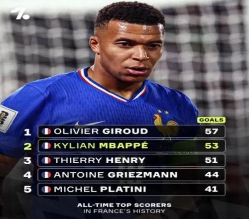 首先,在法国国家队历史射手榜上,姆巴佩以53球排名第二位,仅比排名榜首的吉鲁(57球)少了4球。《马卡报》认为,“姆巴佩很有可能在2026年世界杯之前就打破这一纪录。”